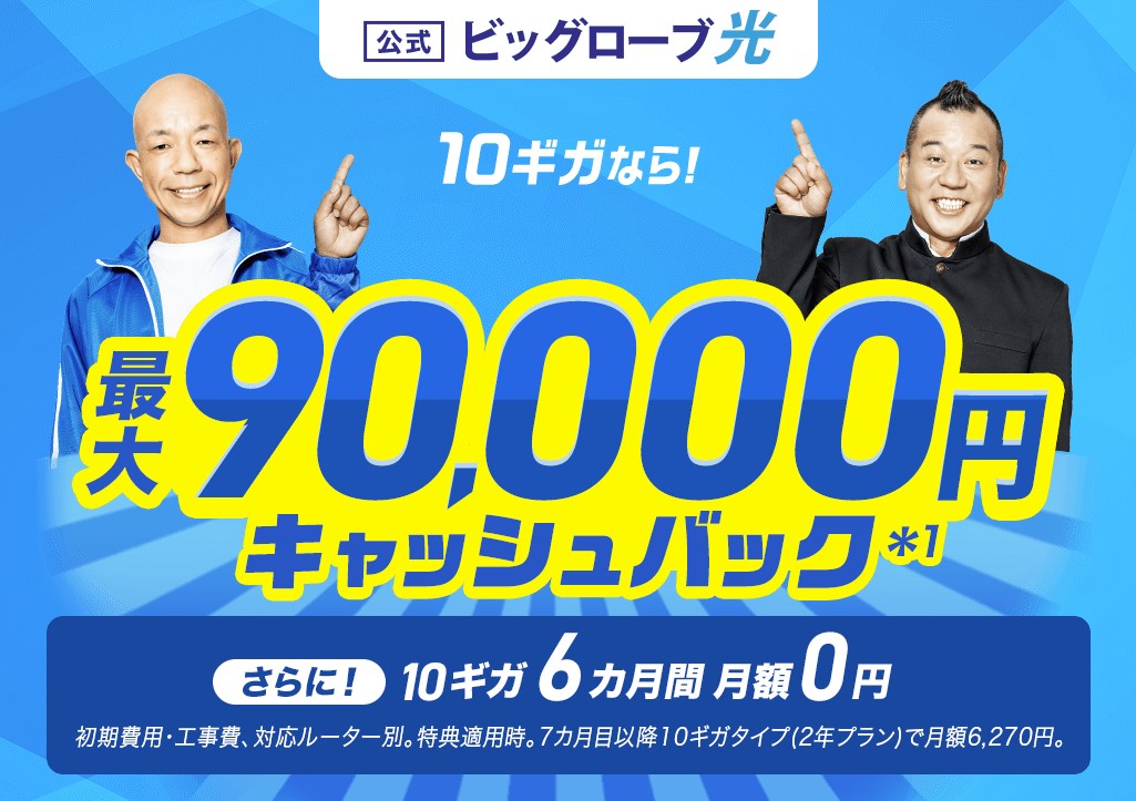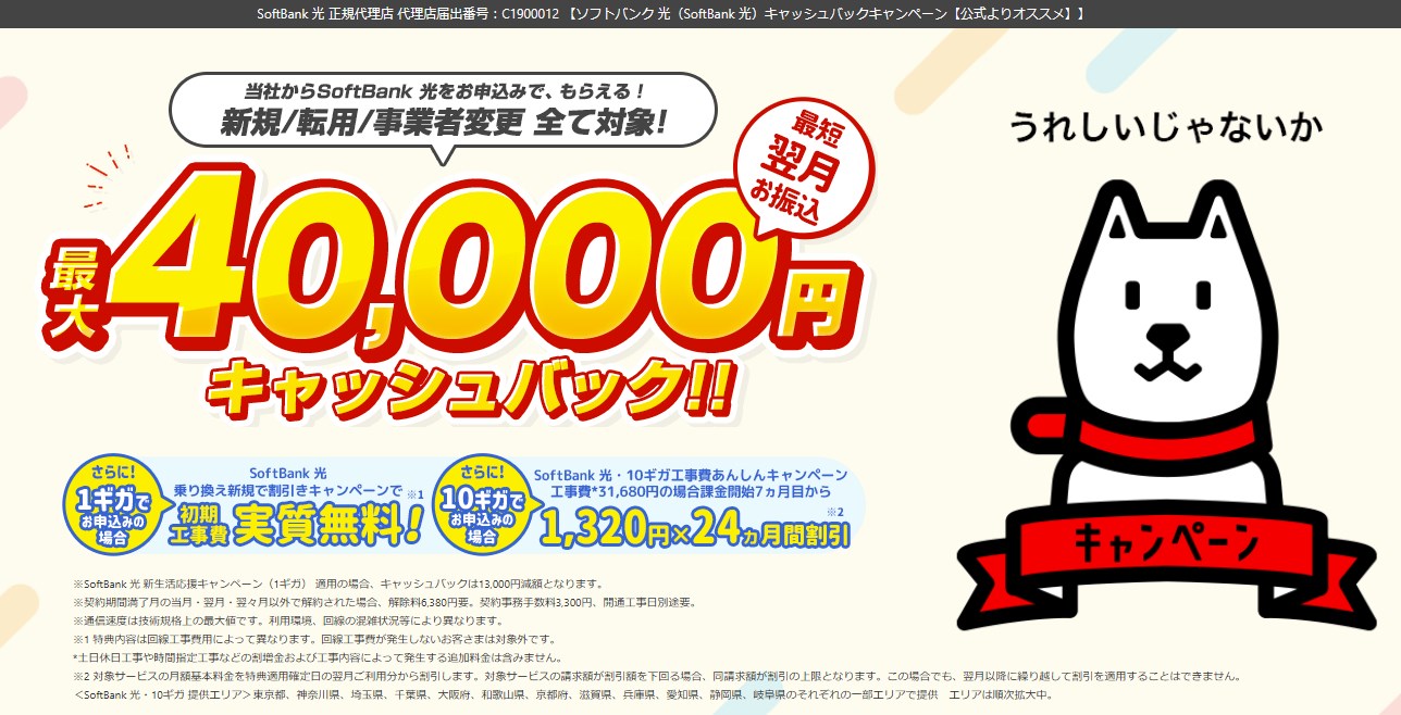 最大40,000円のキャッシュバックに加え、開通月無料、工事費無料などの特典があります。