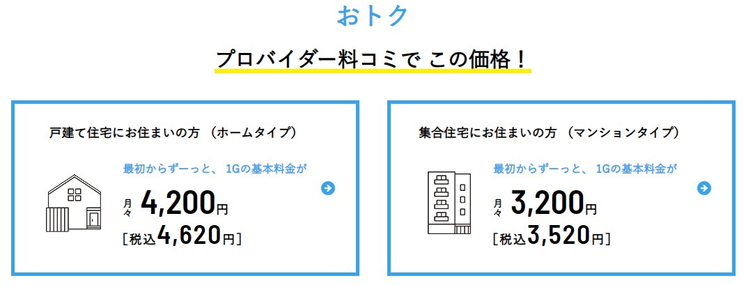 戸建て、集合住宅ともに月額料金が優しいプランが用意されているため、ネット回線のみの契約を目的として使うなら特におすすめです。