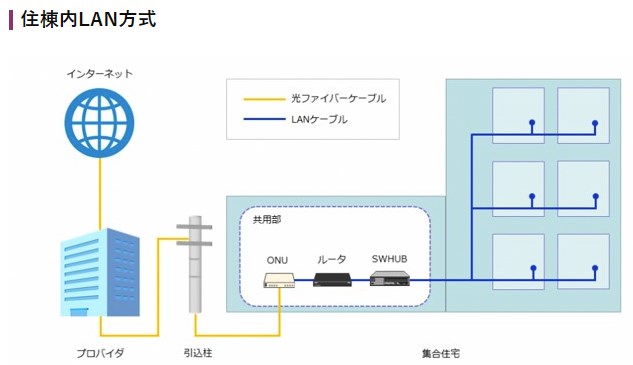 住棟内LANは建物全体にLANケーブルが敷設され、各部屋にLANポートが設置されている方式です。