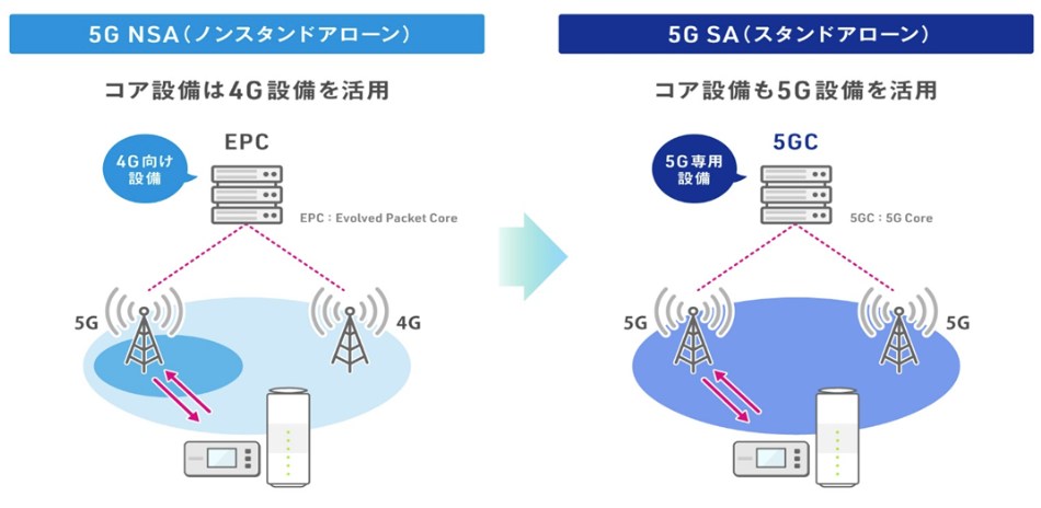 現在、私たちが利用している5Gの多くは「ノンスタンドアローン(NSA)」方式です。これと「スタンドアローン(SA)」方式の最も大きな違いは、コアネットワークにあります。