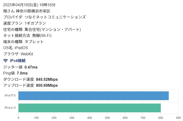 みんなのネット回線速度(みんそく)によると、e-mansion(つなぐネット)の速度測定結果では、例えば神奈川県横浜市栄区の1ギガプランでは下り845.52Mbps、上り800.69Mbps、東京都江東区の1ギガプランでは下り250.8Mbps、上り128.7Mbpsなど、地域や環境によって大きく異なります。
