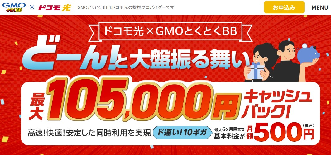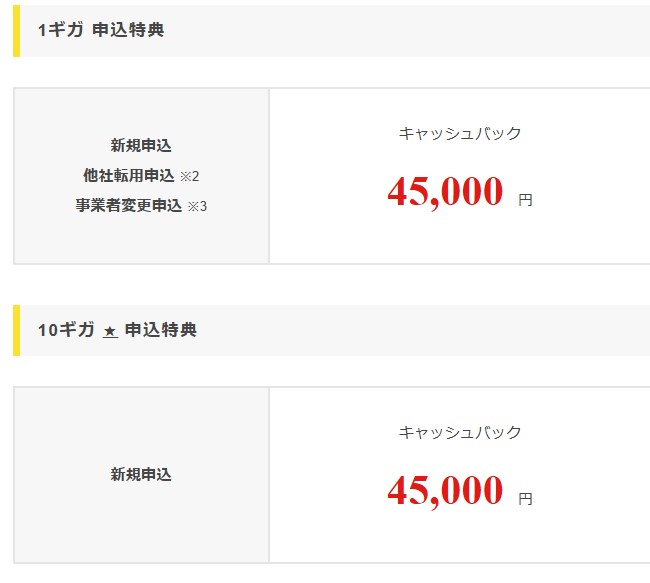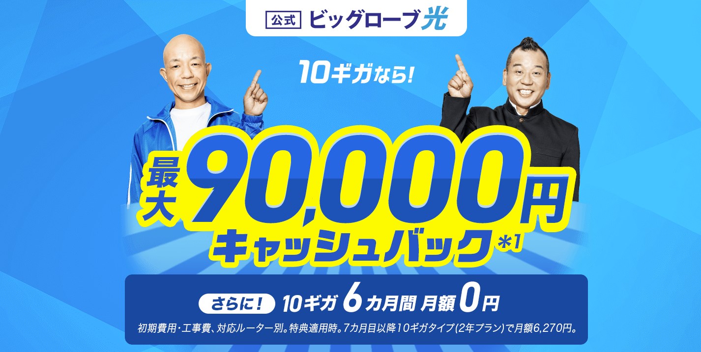 | 特典 | ・月額料金が6ヶ月無料 ・最大90,000円キャッシュバック ・新規工事費実質無料 ・無線LANルーター1年間無料レンタル |
