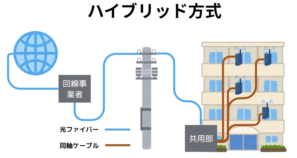 マンションなどの集合住宅でよく使われる接続方式の一つです。建物の共用部分までは光ファイバー、各部屋までは既存の電話回線を使ってデータを伝送します。