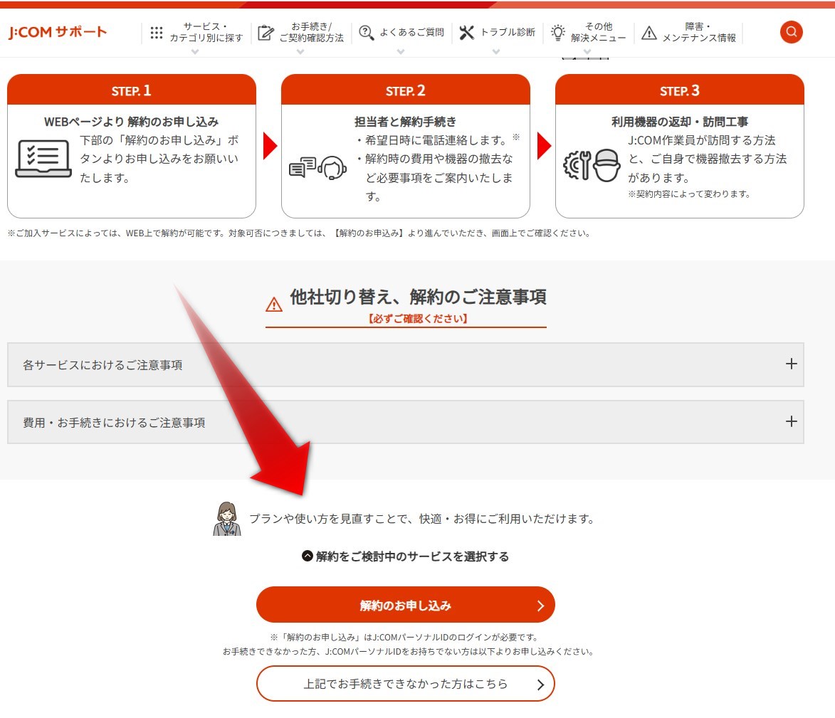 J:COM公式サイトの解約ページにアクセスし、「解約のお申し込み」ボタンをクリックします。解約したいサービスの種類や契約者情報などを入力し、J:COMパーソナルIDをお持ちの場合はログインすると個人情報の入力を省略できます。