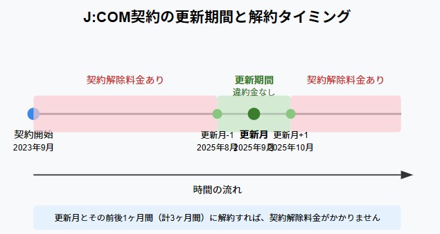 J:COMの解約で最もお得なタイミングは「更新月」です。更新月とその前後1ヶ月間(計3ヶ月間)には、契約解除料金がかからないという大きなメリットがあります。また、最初の更新月であれば工事費の残債も発生せず、最初の更新月を過ぎると割引サービスが終了することが多いため、特に初回の更新月の解約がおすすめです。