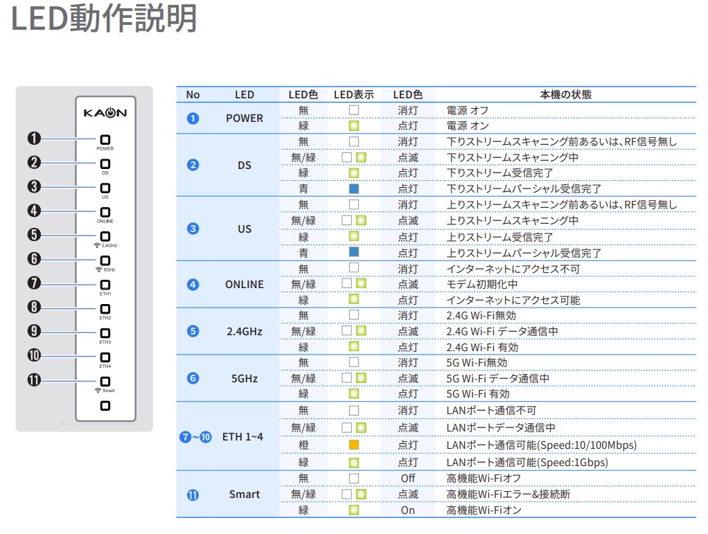 | 消灯 | 電源OFF。電源(プラグ、コード、タップ、コンセントなど)の状態をお確かめください。モデム本体に電源スイッチはありません。 |