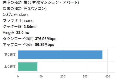 ちなみに、同じエリアの戸建て住宅(実家)のほうでNURO光を契約しています。やはりFTTHなので下りも上りも非常に高速です。マンションではNURO光は物理的に不可能なので使えないのは残念です。