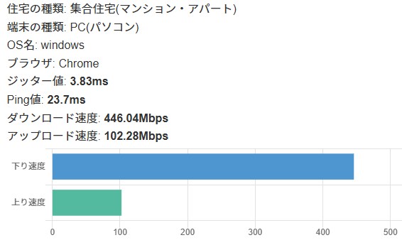 建物は世帯数少ないし空室だらけ、自分以外はみんなVDSLか、インターネット回線自体が無い部屋ばかりの建物でしたから、通信が遅くなる原因はエリ自体の混雑、エリアにおけるNTT利用者が多すぎるのが問題だったのではないか?と考えられます。
