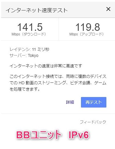 IPv6接続では常時下り80Mbps 上り80Mbpsで安定していました。(PPPoE時代は30Mbps程度で混雑してましたがIPv6で改善できてました)