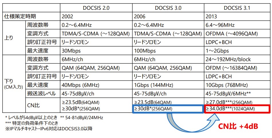 | 仕様項目 | DOCSIS 2.0 | DOCSIS 3.0 | DOCSIS 3.1 |