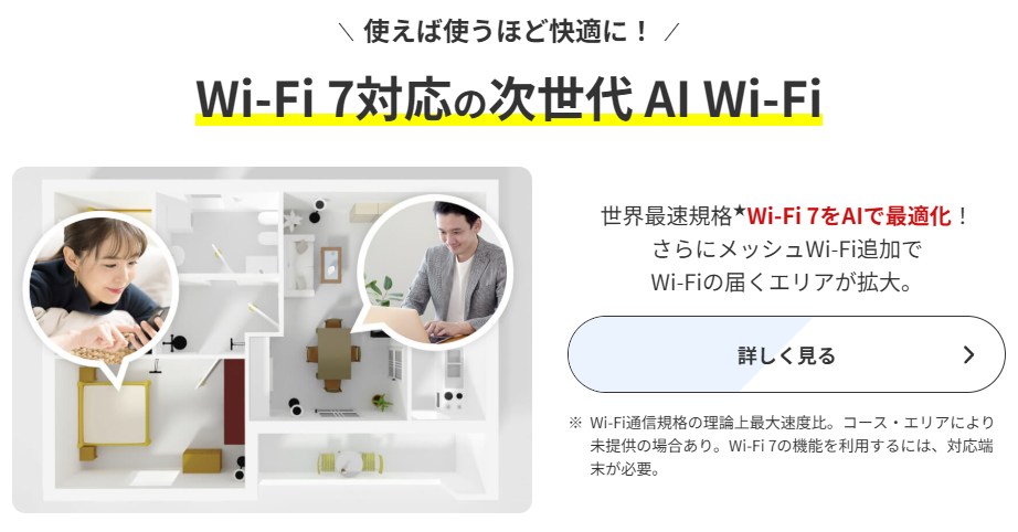 ※ 10G対応Wi-Fiとは:10Gbpsの通信に対応できるWi-Fi7ルーターは高額です。10ギガの通信速度を全開で活用するには10Gbpsのスループット対応ルーターが必須となります。自費購入で1万円~レンタルで月々1100円程度の別途費用がかかります。