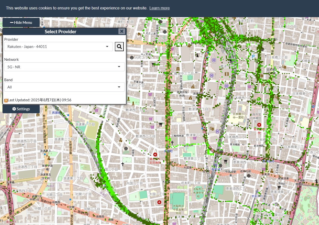 大阪市内ではJR線路沿いにマッピングされてるように表示されるので、JR線路の方向にある窓際にホームルーター本体を設置すると、より効率的な電波受信が可能になるはずです。
