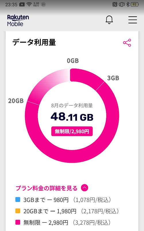 楽天回線ではどうか?同様に日々の我が家のデータ通信量約10GBでレポートします。