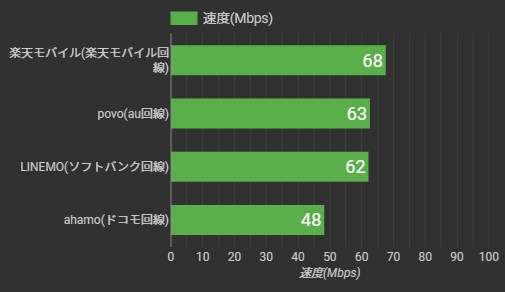 楽天モバイルの通信速度は大手3キャリアと比べても遜色はなく、50Mbpsを超える速度が出ている地域も多く、動画視聴やビデオ通話、アプリゲームなどは問題なく利用できるレベルとされています。