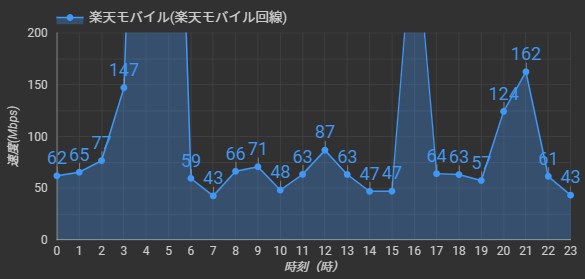 みんなのネット回線速度(みんそく)によると、楽天モバイルのキャリアサービスの平均ダウンロード速度は全国平均で186.25Mbps(9234件の測定結果に基づく)となっています。