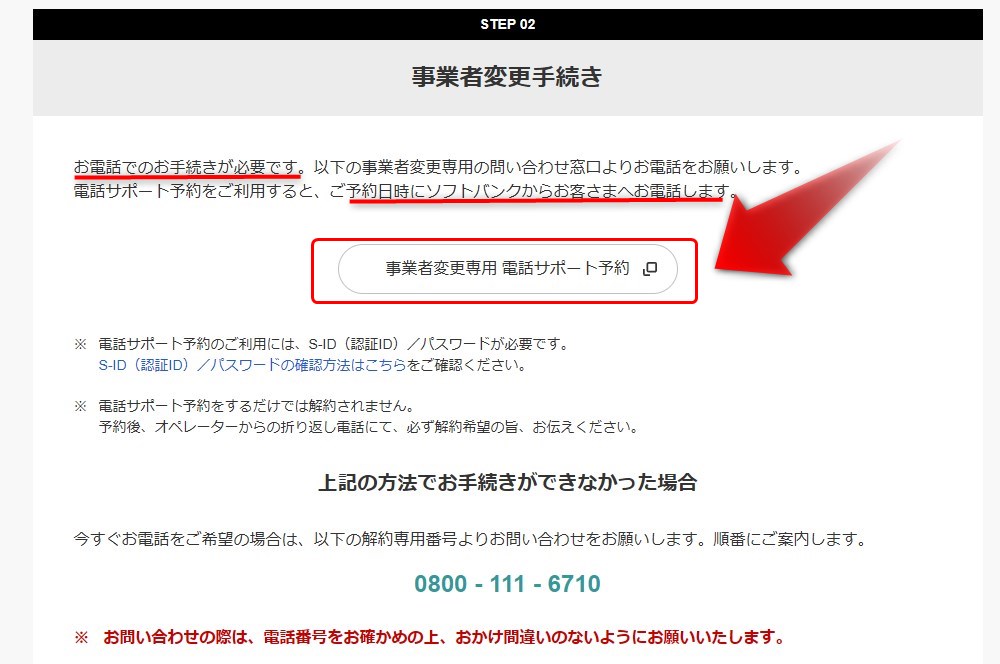 画面を下へスクロールして進めていくと、事業者変更手続きの電話サポート予約へ進みます。