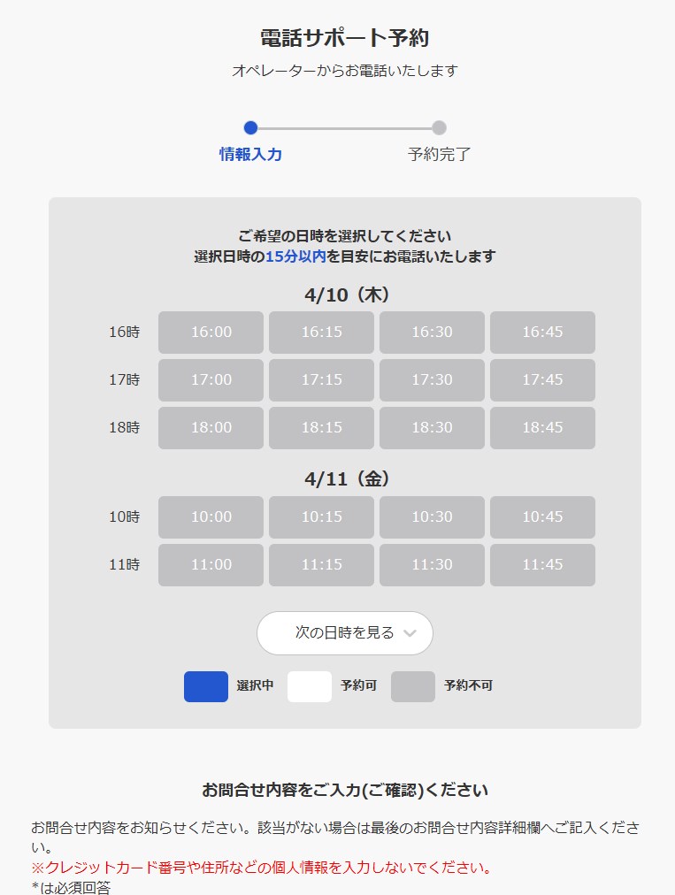 電話サポートの予約画面が出ますので、空きがある日を探します。