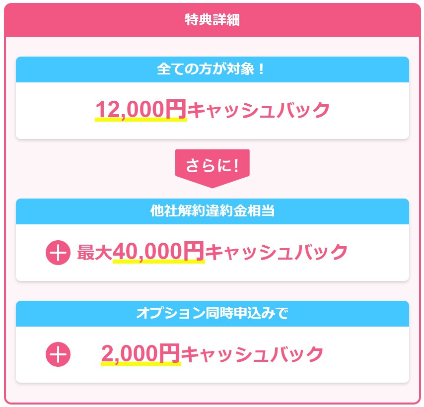 2. 乗り換えキャッシュバック: 最大40,000円