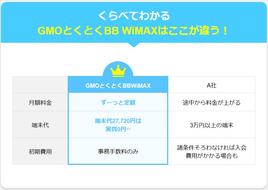 GMOとくとくBBのWiMAXはキャッシュバックキャンペーンでお得に見えますが、キャッシュバック金額と同等の金額に設定された通信端末の代金に割り当てるため、利用者は契約すると、2年目3年目とやや高額になる月額料金を支払う流れとなります。