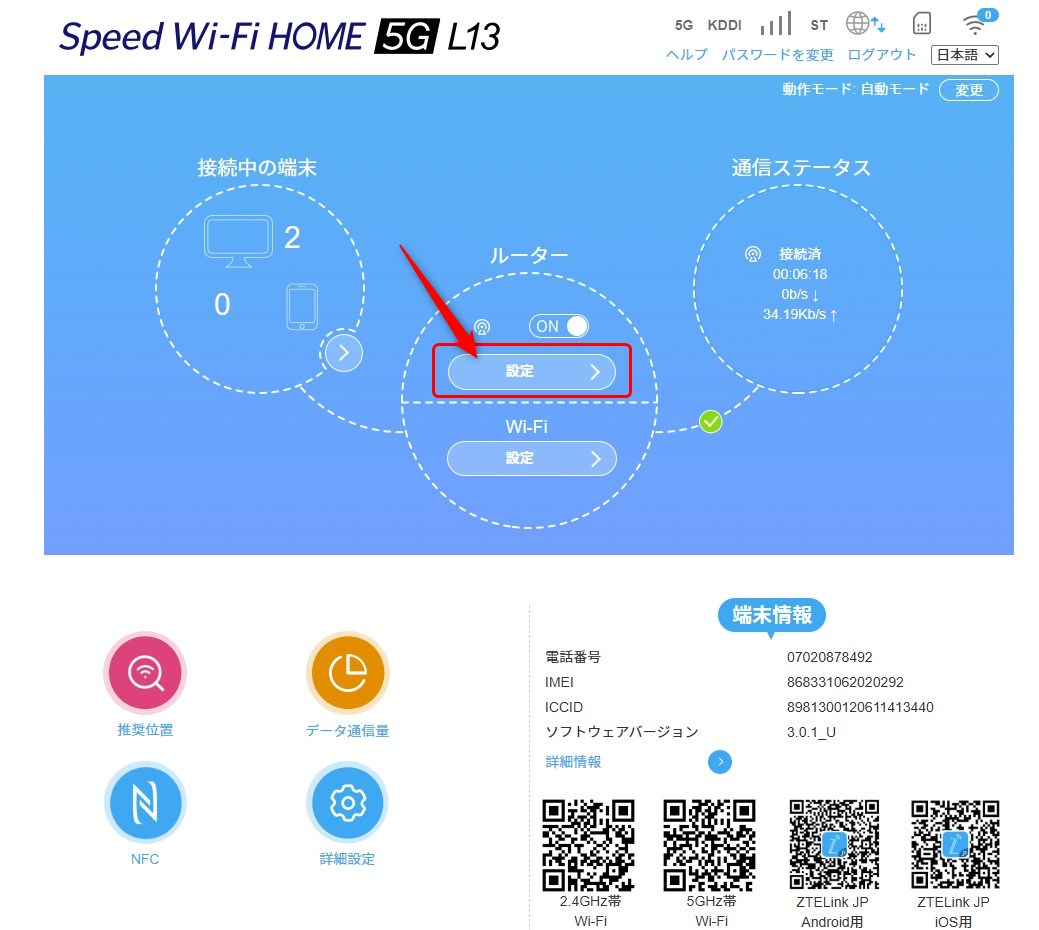 設定画面の中央にある「ルーター」の画像内にある「設定」をクリック