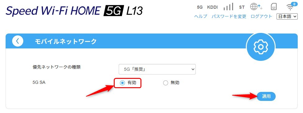 Speed Wi-Fi HOME 5G L13の5GSA設定方法