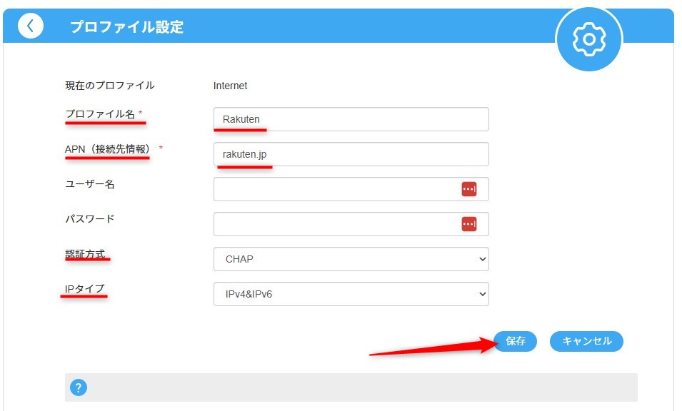 WiMAX回線と併用して楽天モバイルSIM用のAPN設定もできますので、以下に設定方法を残します。
